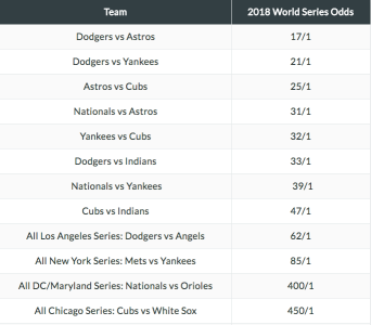 As you can see from the chart, the most likely World Series doesn’t include either Chicago team with a 17/1 chance of LA vs. Houston. Screw that.