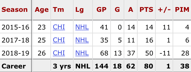Erik Gustafsson is on the payroll for only $1.2M until the end of next season. Even though his defense has been poor this year, for his current offensive production, he is one heck of a bargain. The Blackhawks gave Gustafsson this contract so he could prove to the team what he can do. So far he has definitely been impressive in the offensive zone and on the power play. But the own zone problems for the Swedish-born defenseman give the Blackhawks and their fans some doubt about exactly where he fits in the future.