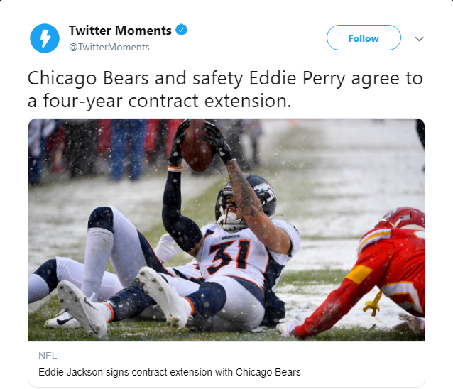 Spot the issue? The first part is that the extension is announced for Eddie “Perry.” Not Eddie Jackson. If that weren’t enough, notice the picture they used. Not only is that not one of Jackson. It’s not even a Bears player. That is Denver Broncos safety Justin Simmons. Two gigantic gaffes in one tweet by the actual platform. Incredible.