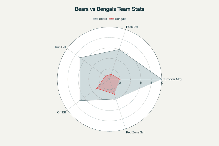 Let’s call it what it is: Chicago’s defense is carrying the team. First in INTs (11), second in third-down defense (31.9%), and #1 in turnover margin at +10. Kevin Byard III is out here robbing fools weekly.