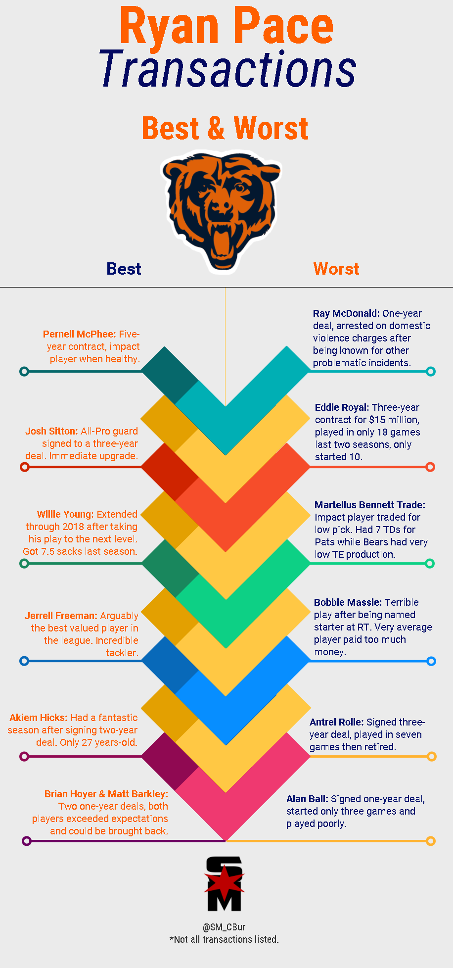 Ryan Pace is the 37 year-old general manager of the Chicago Bears and has been since getting hired back in January of 2015. In the last two seasons, Pace has made a flurry of moves to try and revitalize the Bears’ roster since Phil Emery’s departure…. some have been very good, others … not so much.