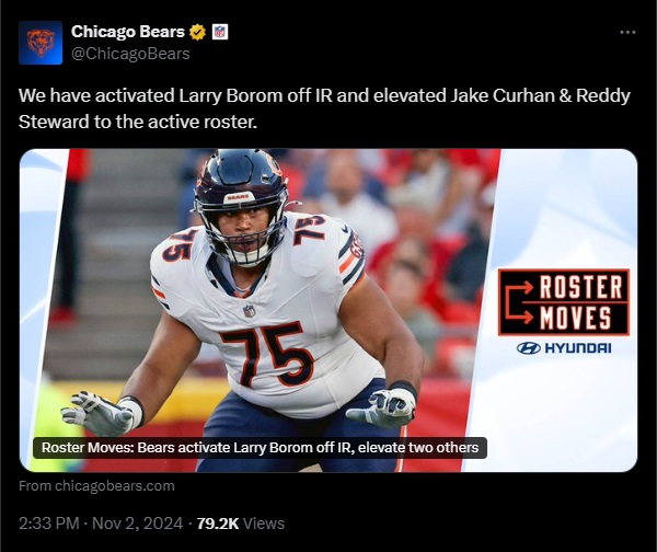 Thankfully, good fortune is on their side. Right as the injuries to Jones and Amegadjie hit, long-time backup Larry Borom was activated from Injured Reserve. He started six games at left tackle for the Bears last season. While he wasn’t anything special, he held his own for the most part. His experience will be a welcome presence at that spot in a game the Bears know they have to win. This will be a big opportunity for Borom, who can put some recent tape out there as he prepares for free agency next season.