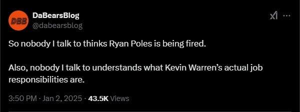 On January 10th, 2022, the Chicago Bears fired GM Ryan Pace. Most people thought the news came from the usual suspects like Adam Schefter, Ian Rapoport, and Tom Pelissero. Those who paid attention would’ve seen it come from a lesser-known stalwart of the local Bears blogging community. Jeff Hughes of Da Bears Blog went on the Irish Bears Network podcast, revealing that the team was parting ways with Pace. It became official not long after. Well, Hughes had an update on Thursday regarding Pace’s replacement, Ryan Poles.
