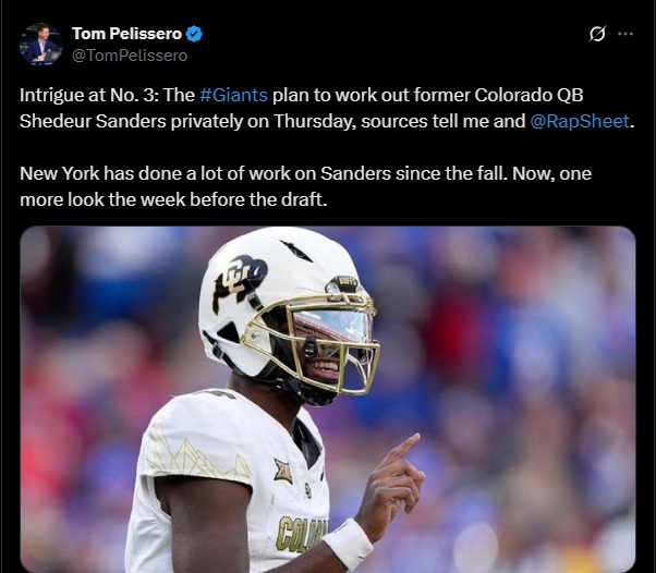 Such an outcome would be unfortunate for the Chicago Bears. If they wish to land one of the top non-quarterback prospects at #10, they need more quarterbacks to go in the first nine picks. Sanders falling doesn’t help them. However, there is a ray of hope. News broke recently that the Giants visited Colorado for a private workout with Sanders. This, along with an update from draft insider Todd McShay, suggests there is still a real possibility the quarterback goes at #3.