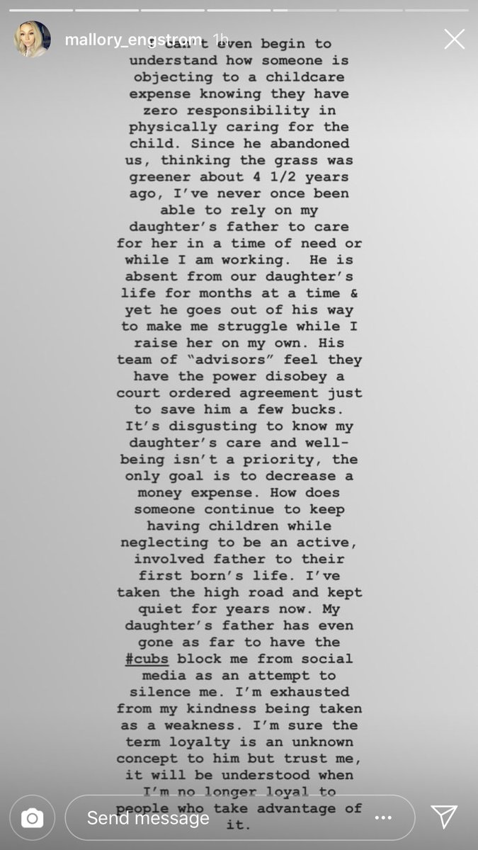 Screenshots from @MalEngstrom’s Instagram page detailing interactions with #AddisonRussell in regards to their daughter. She says she was paid about $600 of child support in quarters and Russell’s advisors “feel they can disobey a court ordered agreement.” .#Cubs pic.twitter.com/vYjWnPJYRo
