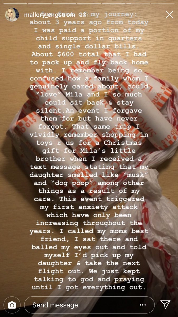 She also shared a story from three years ago about being paid child support in quarters and dollar bills, while recalling the way Russell’s family messaged Engstrom about her daughter.