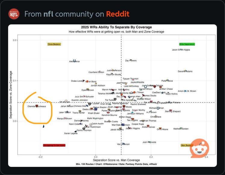 One of the more frustrating decisions by Johnson and his staff was not getting the team’s high draft choices more involved with the offense early. That was reinforced the past two weeks when Colston Loveland and Luther Burden proved instrumental in the comeback wins over Cincinnati and New York. If that wasn’t evidence enough, a new stat chart illustrates it further. It shows every wide receiver’s ability to gain separation this season against zone and man coverage.