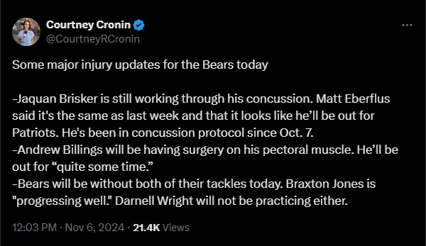 That didn’t happen. In fact, it still hasn’t. Now, according to head coach Matt Eberflus, it won’t happen again this week. Mind you, Brisker suffered the injury on October 6th. That means he has been out a whole month. It would be one thing if this were a knee, ankle, or hamstring issue. The fact it’s a concussion keeping him out this long raises serious red flags about his well-being, both in the short and long term. Forget an extension. Brisker may face the possibility of not playing football again at this rate.