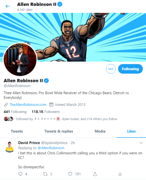 When I heard this I couldn’t believe it at first. I had to rewind the television and listen to it back about 10x before I could fully comprehend the amount of disrespect Collinsworth just showed Allen Robinson on national TV. Apparently I wasn’t the only one who was outraged with this absurd analysis.