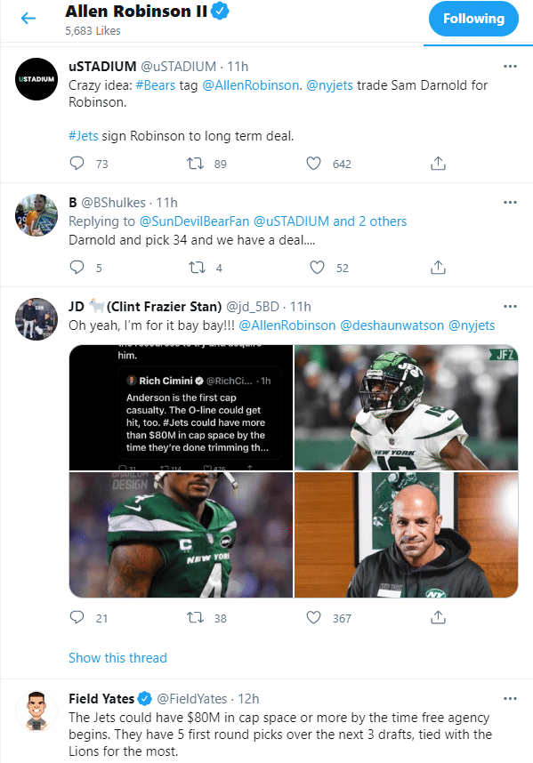 Quite a revelation, yes? So let’s review. Robinson wants a new contract. He wants to get paid big money. The Jets have over $67 million in cap space and a major need at wide receiver. Robinson trains there every offseason. If that weren’t enough, he also told Collinsworth and Sherman he has no qualms about playing with a rookie quarterback. Remember the Jets hold the #2 overall pick.