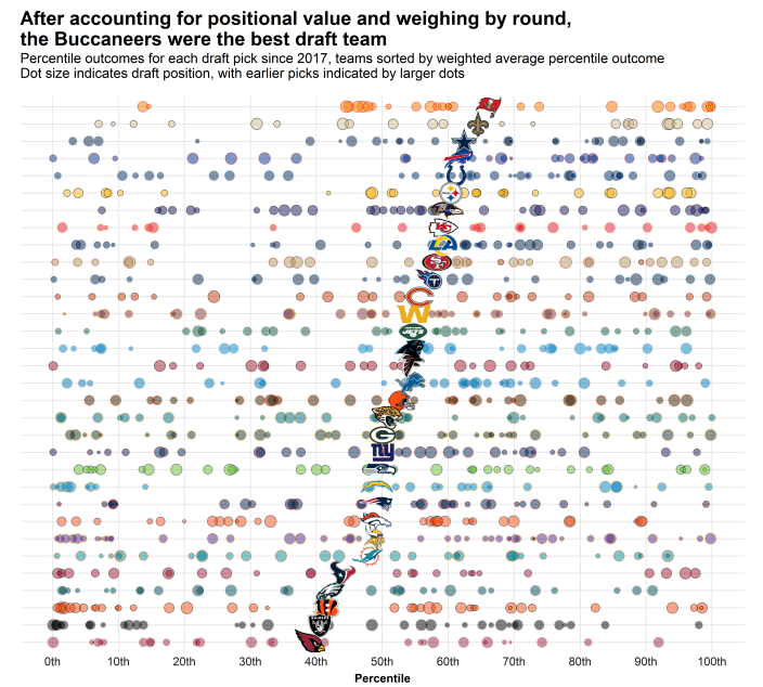 Timo Riske of Pro Football Focus did an interesting study. He wanted to pinpoint the best drafting teams since 2017. After some numbers crunching, some interesting conclusions were reached. When accounting for positional value and weighing by the round a player was selected in, the Bears haven’t done too bad according to his chart. They rank 12th in the NFL. Better than any team in the NFC North.