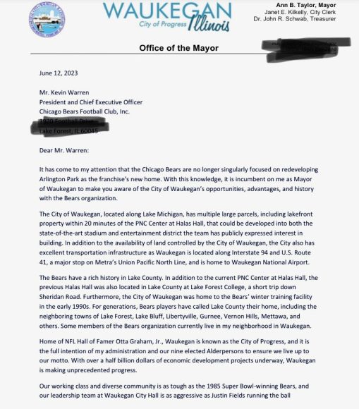 Now it appears more competitors are starting to surface. According to Amanda Vinicky of WTTW, Mayor Ann B. Taylor of Waukegan has decided to enter the fray. She sent a letter to Warren detailing why her township would be an ideal location for the stadium and entertainment district the Bears want. For one, it’s located only 20 minutes from the PNC Center at Halas Hall. She also cited her city’s excellent transportation infrastructure along two highways, a major Union Pacific train line, and the Waukegan National Airport.