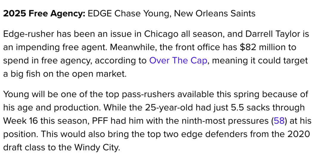 Acquiring Young won’t be cheap, with his market value expected to range from $13-15 million annually. However, the Bears are in an excellent financial position thanks to significant cap space heading into 2025. With Sweat already under contract and Young still in his prime, Chicago can make a long-term investment in building one of the league’s top defensive lines.