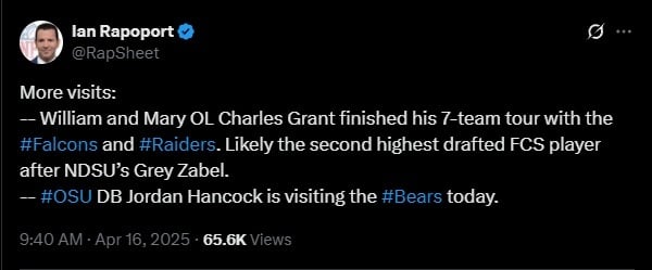 Another update from Ian Rapoport shows they’re looking into such insurance. The Bears are meeting with Ohio State defensive back Jordan Hancock. While listed as a cornerback, most see him as a safety in the NFL. His style of play mirrors Brisker with the physicality, tackling prowess, and knack for making things happen around the line of scrimmage. Most believe he needs more developmental time, which would explain why the Bears could take him on Day 3, hoping to develop him for a year behind Brisker.