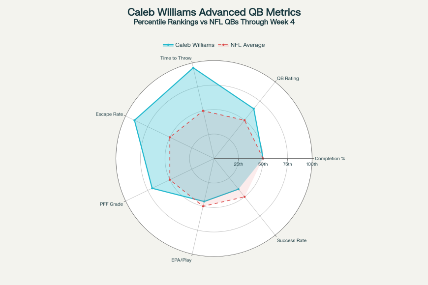 Caleb Williams is legit. He’s not perfect, but he’s clearly growing each week. His 75.0 PFF grade puts him just outside the top 11, and he’s leading the league in time to throw (3.07s) and escape rate (8.8%). Translation: the dude can extend plays without playing hero ball. He’s thrown for 927 yards, 8 TDs, and only a couple “rookie learning curve” mistakes.