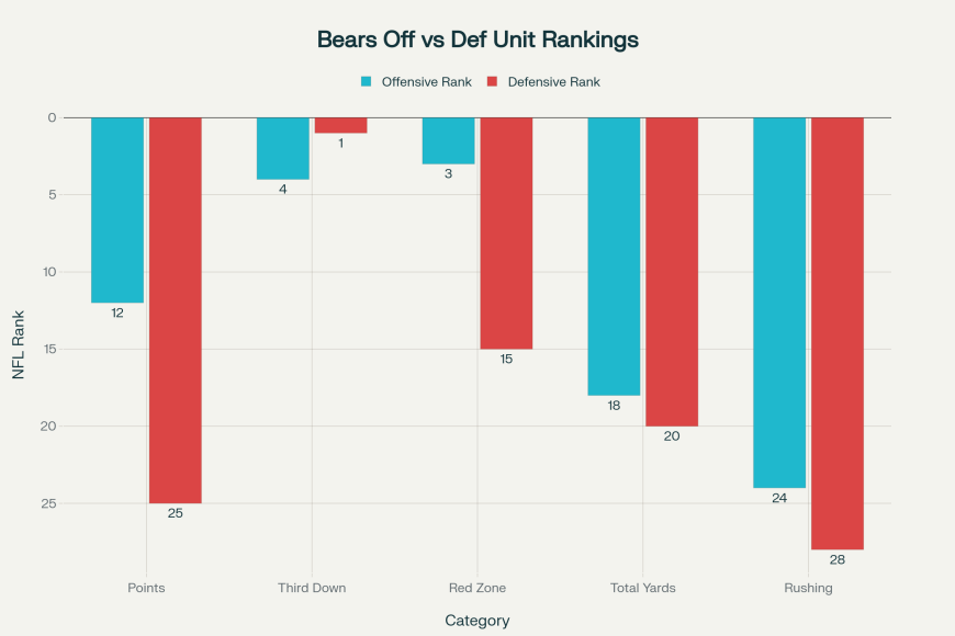 Ben Johnson has injected this offense with something Bears fans haven’t felt since… ever? Competence. Swagger. Cohesion. Take your pick. The red zone, long a place where Bears drives went to die, is now a murder zone — for opposing defenses. Chicago ranks 15th in red zone TD efficiency (63.64%), a stark drop from earlier weeks. That’s not terrible — but it’s nowhere near elite — and that’s a big drop from where they were before the Raiders game, when they ranked 3rd. Still, considering last year they were dead in the water inside the 20, this is a major leap forward for Ben Johnson’s offense.