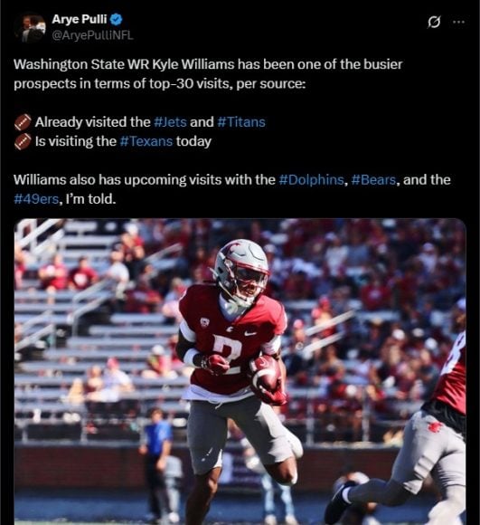 It isn’t a secret that head coach Ben Johnson loved speed. That was proven many times during his run with the Detroit Lions. If he doesn’t believe Scott can fill that role, and there is no evidence he should, then it makes sense the Bears would go hunting for a replacement in the draft. Arye Pulli revealed on Twitter (X) that the team met with one such solution: Washington State receiver Kyle Williams.