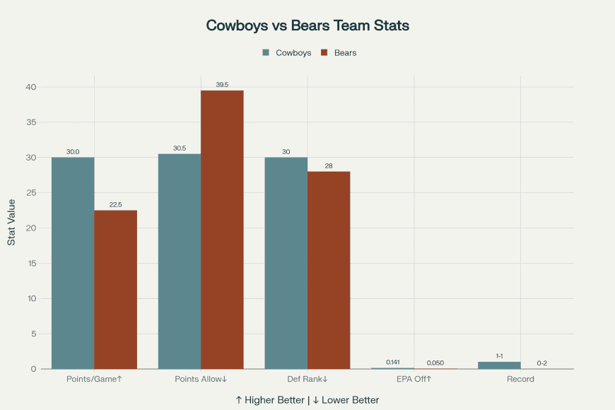 Let’s not sugarcoat it: both defenses are disasters. Dallas gave up 450 passing yards to Russell Wilson last week. Russell Wilson! That’s the same Russell Wilson people were writing off as washed, and Dallas made him look like an MVP candidate. Meanwhile, the Bears are giving up nearly 40 points per game and lead the league in passing touchdowns allowed. Opposing QBs have had clean pockets all day because Chicago is generating pressure on barely one out of every five dropbacks.