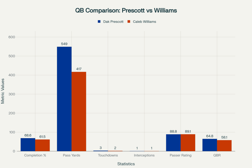 Let’s be fair to the rookie — he’s not Dak yet. Prescott is hitting nearly 70% of his passes, Williams is barely at 61%. But stats only tell part of the story. Caleb is being asked to drag a broken roster into relevance, while Dak has a top-five supporting cast around him. Dallas’ receivers rank top-10 in yards after catch, and their offensive line ranks 6th in pass-block win rate per ESPN. By comparison, Chicago’s line sits in the bottom third, and Caleb has been pressured on nearly 38% of his dropbacks. That’s a brutal context for a qb making only his nineteenth NFL start.