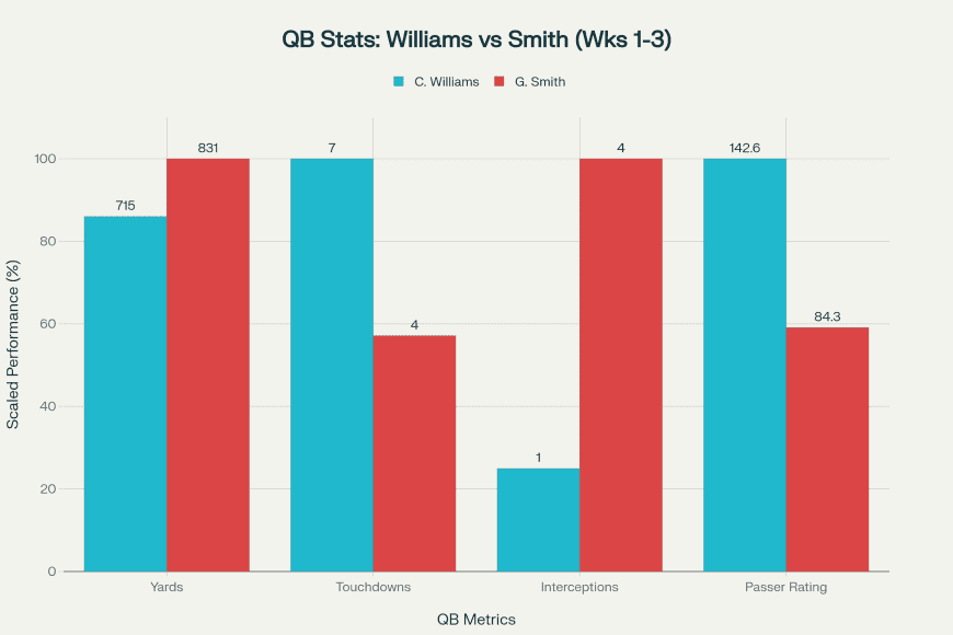 QB Stats (Weeks 1-3, 2025): Caleb Williams vs. Geno Smith.