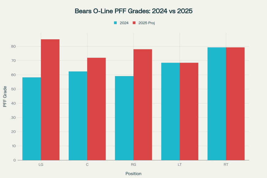 I want to believe in this line. I do. Chicago made upgrades with Joe Thuney, Drew Dalman, and Jonah Jackson. But left tackle? Still a flaming question mark. Braxton Jones has flashes, but he’s inconsistent and coming off injury. His 68.5 PFF grade last year is basically a “C-” report card. And here’s the stat that should terrify Bears fans: