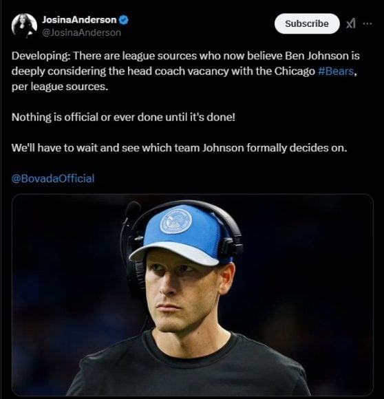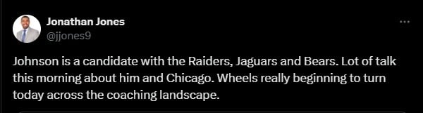 The past week has suggested it wouldn’t be the case. Many around the league felt the Las Vegas Raiders, led by part-owner Tom Brady, were making a strong push to lure Johnson. They’re even interviewing a GM candidate with direct ties to him. However, two prominent insiders have changed the outlook of this situation. Jonathan Jones of CBS Sports started it by saying there is a “lot of talk” about Johnson and Chicago. Then Josina Anderson, who is notorious for not giving many details, dropped a bombshell stating Johnson is “deeply considering” the position.