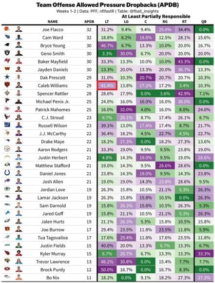 Jones has looked rough through the first two weeks. We always knew that you had to live with certain deficiencies in his game. Yet something has looked off since the season began. It still seems as if he’s not healthy. Opponents have taken full advantage, disrupting several offensive plays. The numbers are even less flattering. Football Insights released a data chart showing every team’s allowed pressure on dropbacks. It includes the percentage of each position on the line, showing where most of it is coming from.