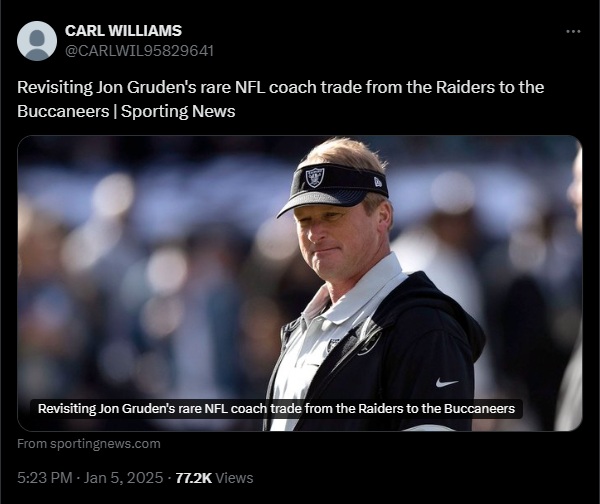 It appears Mr. Williams may have done it again. He posted something on his Twitter feed that didn’t generate much buzz because it came on a Bears game day, but the implications of it are massive. It was an article detailing the trade of former head coach Jon Gruden from the Oakland Raiders to the Tampa Bay Buccaneers in 2002. Maybe it’s jumping to conclusions, but this feels like it might be a hint at what the Chicago Bears have planned for their upcoming coaching search.