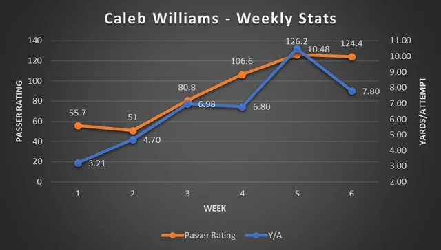 Fast forward to Weeks 4-6, and it’s a different story. Williams has improved drastically in every major statistical category. His completion percentage jumped to an impressive 74%, while his yards per attempt skyrocketed from 5.3 to 8.5. He’s thrown seven touchdowns against only one interception over that span, showing he’s becoming more comfortable reading defenses and attacking them confidently.