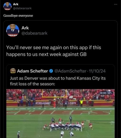 A week before the game, the Denver Broncos were in the exact same position to beat the Kansas City Chiefs with a 35-yard field goal. It was blocked. A Bears fan named Ark declared on Twitter (X) that people would never see him again if the same thing happened against Green Bay the next week.