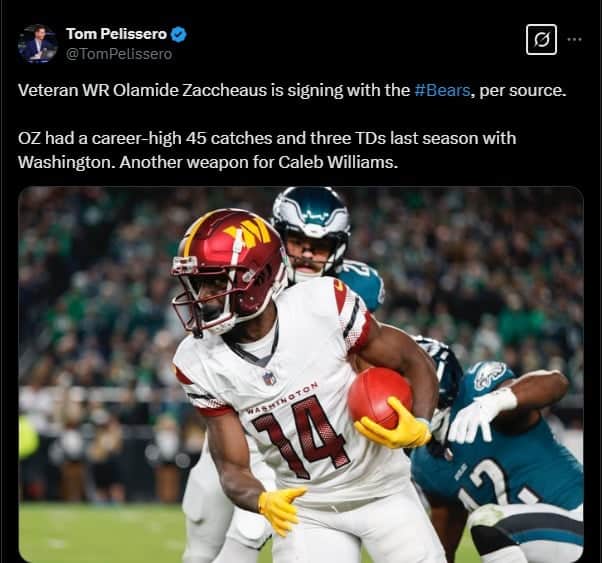 Tom Pelissero of NFL Network revealed the Bears had reached an agreement with former Washington Commanders receiver Olamide Zaccheaus on a new deal. A former undrafted free agent, he climbed his way up the NFL ranks with the Atlanta Falcons before signing with Washington last year. He produced a career-best 45 catches for 506 yards and three touchdowns. On top of that, he added 179 yards on 17 punt returns. His versatility should be something Johnson takes immediate advantage of.