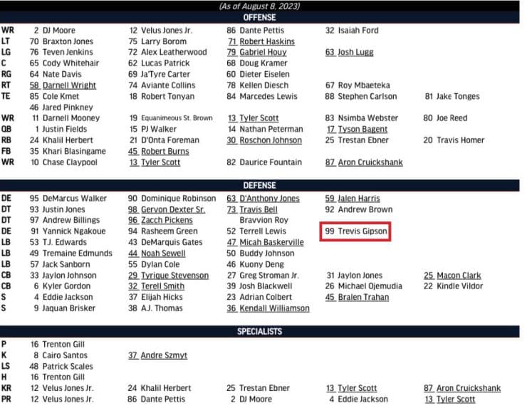 There were some minor surprises on the offensive side. Dante Pettis is listed as the seventh receiver, meaning he likely doesn’t make the team if the final cuts were today. Trestan Ebner is ahead of free agent addition Travis Homer at running back. Aviante Collins appears to be in the mix for the primary backup tackle spot. However, the biggest surprise came on the defensive side, where Trevis Gipson was spotted at the bottom of the edge rusher depth chart. It isn’t an exaggeration. He literally sticks out like a sore thumb.