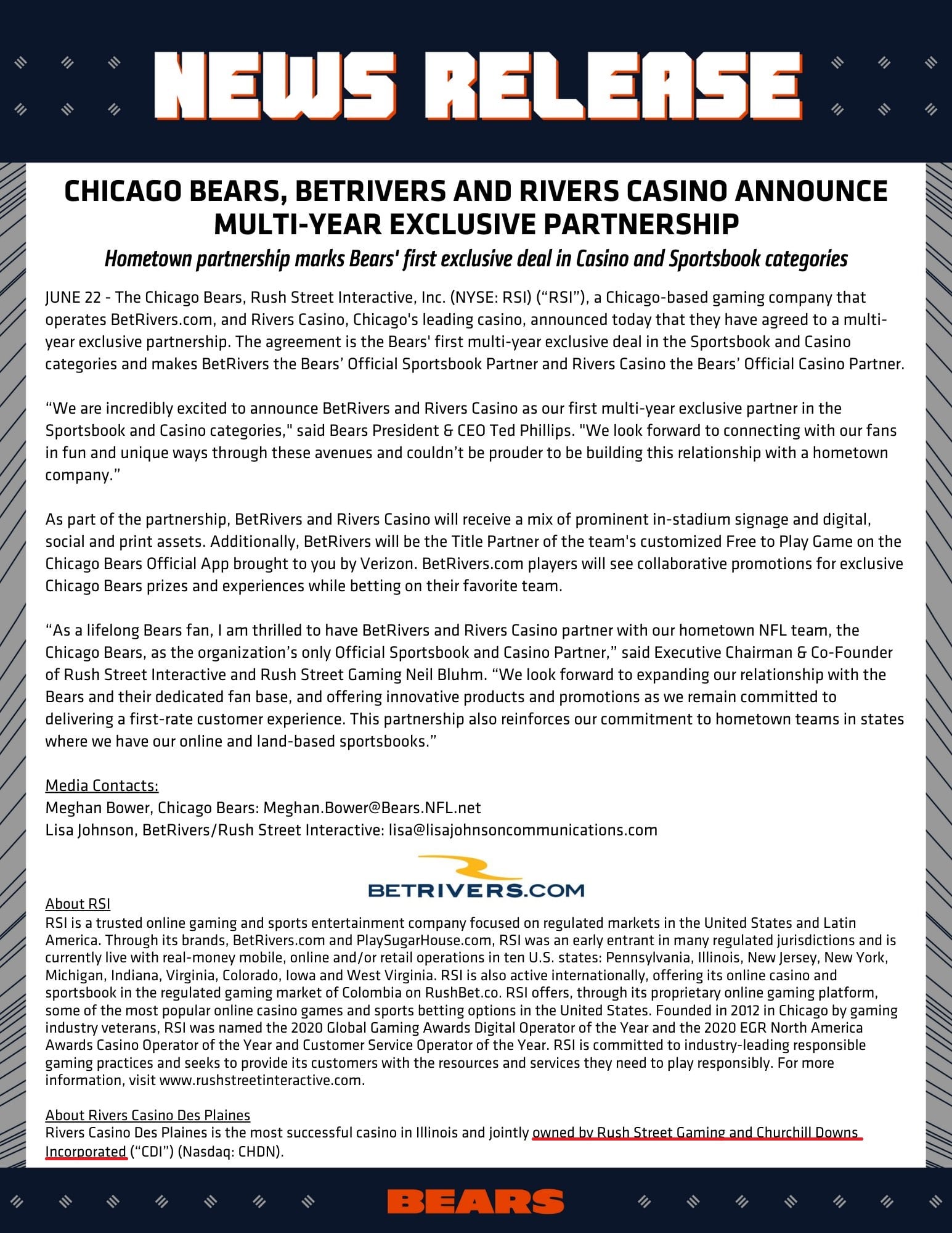 It isn’t clear yet who delivered the winning bid on the property. Even so, warning signs are increasing that the Bears aren’t doing this as a publicity stunt. This is real. The latest evidence comes in their most recent press release. One where they announced a new multi-year partnership with BetRivers and Rivers Casino. This deal makes both the official sportsbook and casino partners of the organization. What makes this so interesting? Rivers Casino is owned by Churchill Downs Incorporated.