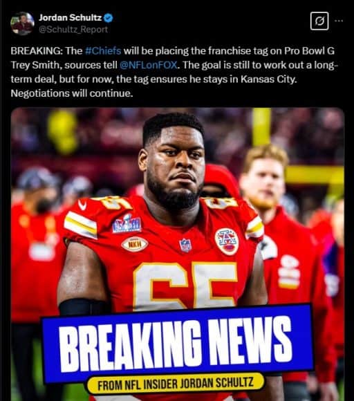 The Chicago Bears know they have to improve their offensive line this off-season before starting the process of helping Caleb Williams improve. One of the big hopes for many was Pro Bowl right guard Trey Smith being available when free agency arrived next month. He would’ve been an immediate upgrade for them. Sadly, it appears the market won’t cooperate. According to several insiders, the Kansas City Chiefs have placed the franchise tag on Smith, ensuring he will be under contract for the 2025 season.