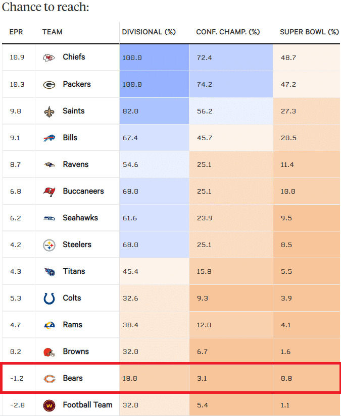 The Saints are 3rd at 27.3%. Chicago? They have the lowest of any team in the entire field at a whopping .8%. Not even the Washington Football Team, who finished 7-9 have a worse mark than that. They’re sitting at a hefty 1.1%. That is how little confidence people have in the Bears. A clear indication they view the team as nothing more than an occupier of a playoff spot.