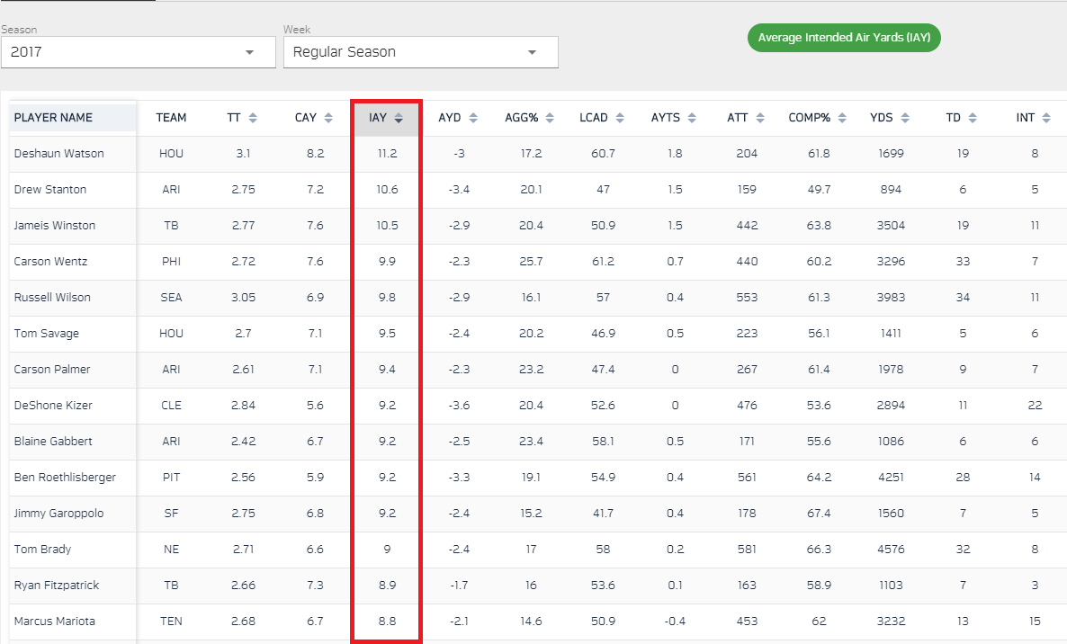 The question is whether he has the right idea with something like that. So I dug into last year’s quarterback stats. Specifically, I was looking for an offensive impact based on those who tended to attack more often down the field. I found an answer via the NFL.com NextGen stat called “Intended Air Yards.”