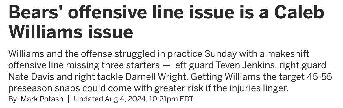 Talent hasn’t been the issue. The Bears do seem to have some athletic and physical blockers. Unfortunately, none of them have been able to stay healthy. Left guard Teven Jenkins has missed 20 games across three seasons in Chicago. Right guard Nate Davis missed six games last year and hasn’t worked much in training camp. Even right tackle Darnell Wright had to battle a shoulder problem last season. It was hoped the Bears could count on some good fortune in the health department this year.