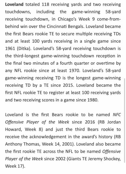 It was pure heroics on Loveland’s part. The fact that he did it as a rookie made it all the more impressive. What Bears fans didn’t know at the time was it was also historic. Loveland was declared the NFC Offensive Player of the Week for his performance. A press release revealed that this was the first time since 2002 that a rookie tight end has claimed the honor. Jeremy Shockey was the last one. Loveland is also only the third Bears rookie in history to win it, joining Jordan Howard and Anthony Thomas.