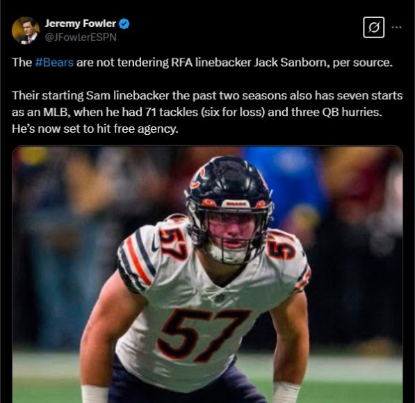 Nobody disputes that the Chicago Bears have a talented defense. However, the arrival of Dennis Allen as the new defensive coordinator almost guaranteed changes. His philosophies are not the same as Matt Eberflus’s. While reports indicated the secondary was largely set, expecting changes on the front seven might be wise. Sure enough, the first domino fell shortly after that came to light. According to Jeremy Fowler of ESPN, the Bears won’t be tendering restricted free agent Jack Sanborn.