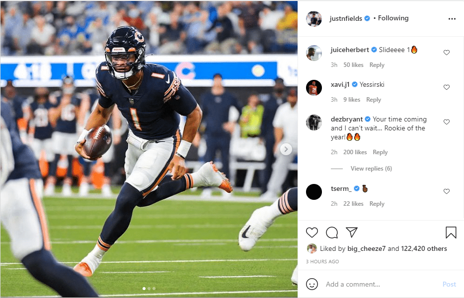 Former NBA legend Dwyane Wade also commented on the post. That is less of a surprise. Though a lifetime Miami Heat star, Wade is a Chicago kid at heart and a huge Bears fan. So his excitement about Fields is perfectly understandable. This should serve as a reminder to everybody of exactly what this kid represents. He is box office. His natural charisma is evident not just in how he plays but how he carries himself.