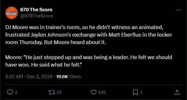 He became the first to reveal what other players thought about the confrontation publicly on Mully & Haugh for 670 The Score. Did he think Johnson went a little overboard? Not in the slightest. Moore applauded his teammate for having the courage to stand up and say what many others were feeling.