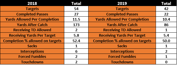 There is a lot of information that can be pulled from this chart, none being more evident than the fact that Jackson is being targeted at an alarmingly low rate. This shouldn’t come as a surprise as Jackson is one of the best safeties in the entire NFL.