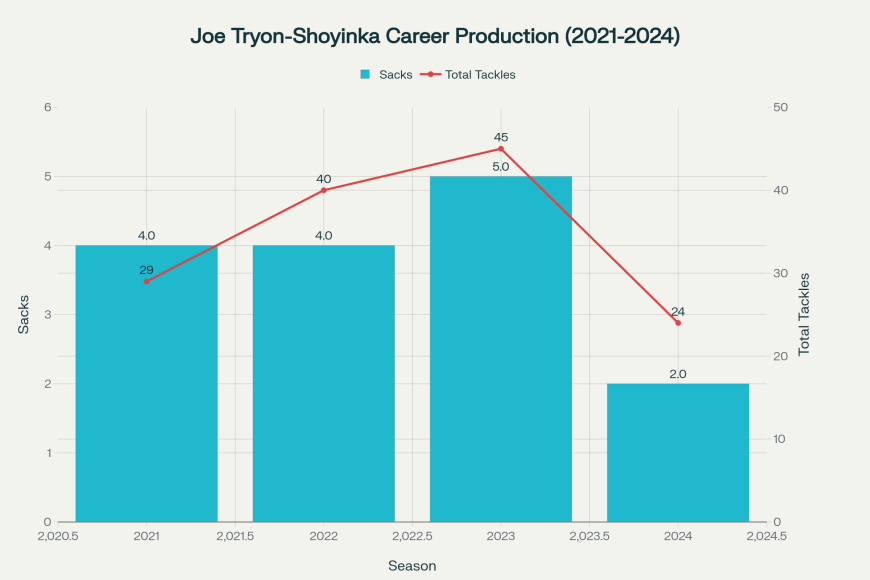 They’re missing three rotational guys who actually mattered, and Sweat can’t play every down. So Tryon-Shoyinka becomes the emergency filler. He’s the tire you throw on your car when you’re stranded — not made for performance, just for survival.