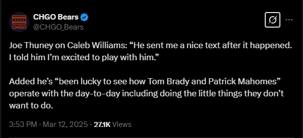 Thuney explained to Bears media at his introductory press conference that he offers something else Williams can take full advantage of. He is one of the precious few players in the entire NFL who had the chance to play with both Tom Brady and Patrick Mahomes. The two men hold a combined ten Lombardi trophies and are considered the gold standard of modern quarterbacks. Much of that success came from their laser focus on details and willingness to make necessary sacrifices.