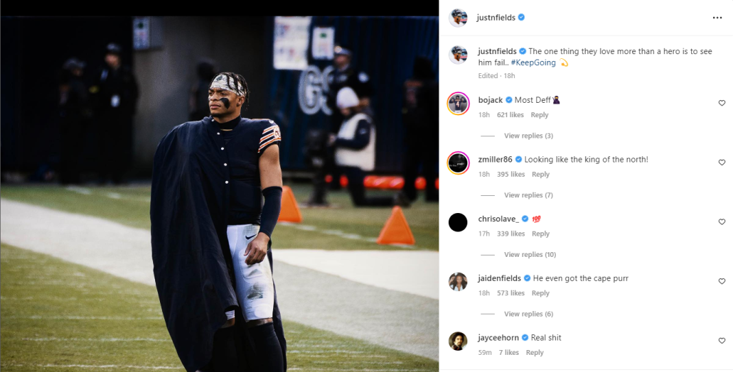 Those people don’t like what they’ve seen lately. Fields has amassed 1600 yards, 15 touchdowns, and only three interceptions in the past six games. The Bears offense has scored at least 29 points per game for a solid month. Most of that is entirely thanks to Fields’ unique gifts. While not vocal on social media too often, the young quarterback couldn’t resist a subtle shot at his critics on his Instagram. He put up a picture of him with a simple line attached.