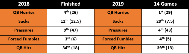 Now that you’ve had the chance to read over the chart, you can see that Mack is still a truly disruptive force in 2019. These numbers are insane when you add in the fact that every offense filters their game-plan around stopping Khalil Mack. I know we aren’t seeing those ‘what the hell did Mack just do’ type of moments as frequently as we grew accustomed to but trust me when I say this.