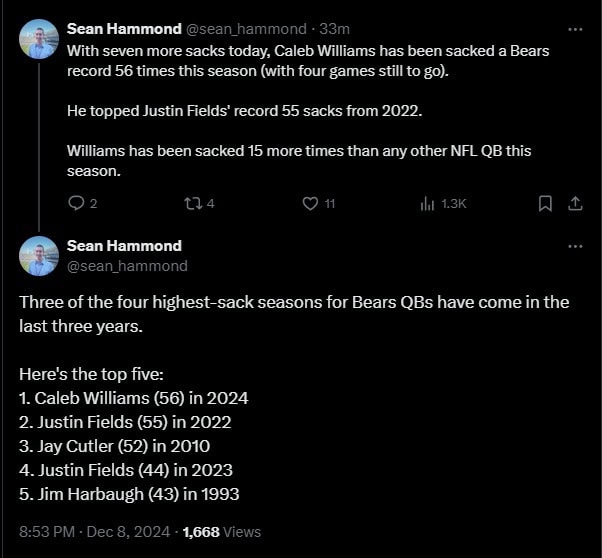 In that regard, Poles has been a failure. He kept Matt Eberflus despite significant concerns about his ability to develop a quarterback with his defensive background. However, that isn’t the most damning evidence against Poles. It is his mystifying inability to stabilize the offensive line. Williams has now been sacked 56 times this season, which is now the most in franchise history. There are still four games left. At this current Pace, Williams will be sacked 73 times, which would be the second-most in NFL history behind only David Carr’s 76 in 2002.