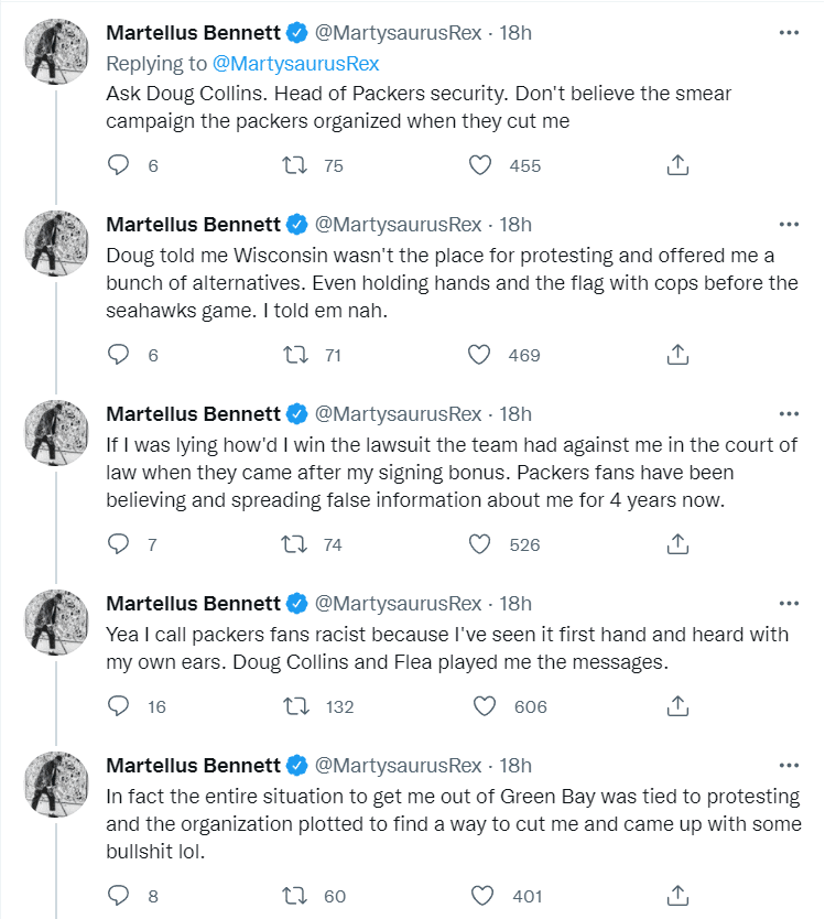 So to recap. Bennett calls Packers fans racist. Called the organization crooked and gutless. They did everything they could to stop him from protesting. Remember this was at the height of the Colin Kaepernick controversy. The last thing they wanted was a strong personality like him stirring the pot. So based on what he’s saying, they used an injury he’d suffered as a loophole to eventually cut him loose. When they tried to get some of the money back from his contract, he seemed to have enough dirt on them to win the case.