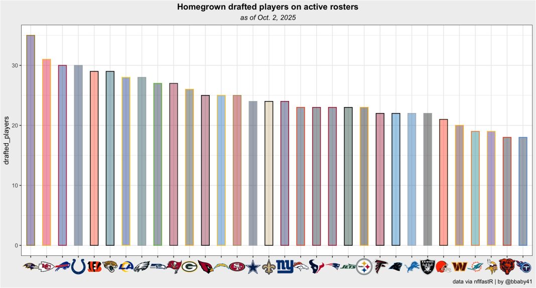 Four years later, those words come across as nothing more than fancy lip service. Poles failed to keep his word in every regard. Rumors are that he doesn’t operate with open communication or candor. He hasn’t been “selective” in free agency and hasn’t fixed the team’s weaknesses. Worst of all, he hasn’t built through the draft. A new graphic showing how many homegrown players each organization has on its roster says it all.