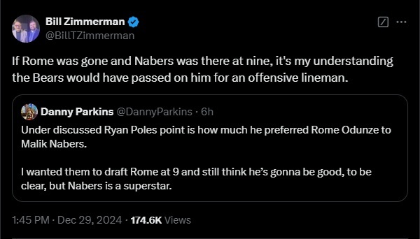 Had the New York Giants taken Odunze at #6, the Bears would’ve just gone with LSU receiver Malik Nabers, right? Nope. Bill Zimmerman of Windy City Gridiron dropped that little nugget. If Odunze wasn’t there, Poles would’ve gone in a totally different direction.